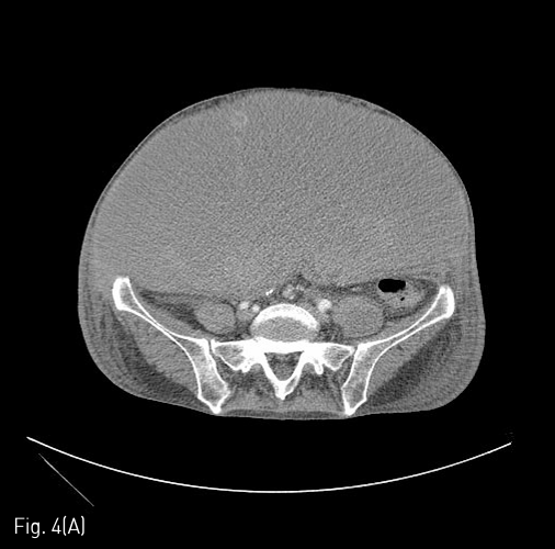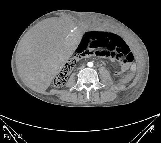 (A) 4 days later, the size of the abdominal wall hematoma was more increased (about 31 x 15cm), and posterior displacement of the visceral organs was noted on follow-up abdomen CT.