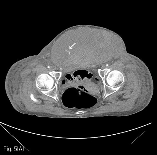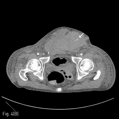 (B) Another active bleeding focus was detected at left lower abdominal wall near by the left suprapubic inguinal area.
