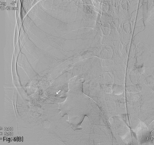 (B) Extravasation was noted from the small branch of right musculophrenic artery of the right internal thoracic artery, which was treated with glue embolization.
