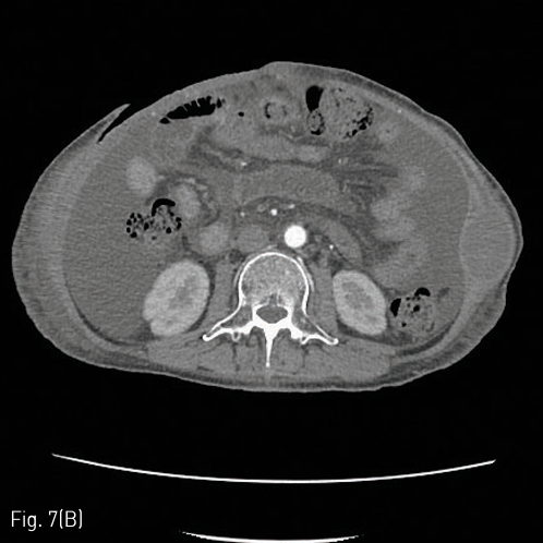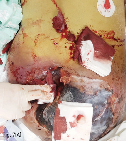 이후 환자는 복벽 혈종 및 피부 결손에 대해 괴사조직제거술을 시행하고 성형외과적 피판성형술 계획 및 보존적 치료하였으며 (Fig. 7A, 7B), 증상재발 없이 경과 관찰중이었으나, 입원 109일째 전신상태 및 폐렴 합병증의 악화로 사망하였다