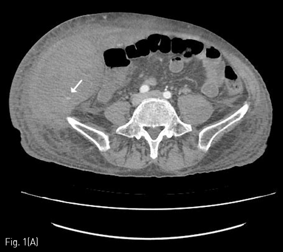 (A) Abdomen CT shows hematoma of right abdominal wall (about 13 x 9cm) and an active bleeding focus from the small branch of the right deep iliac circumflex artery (arrow).